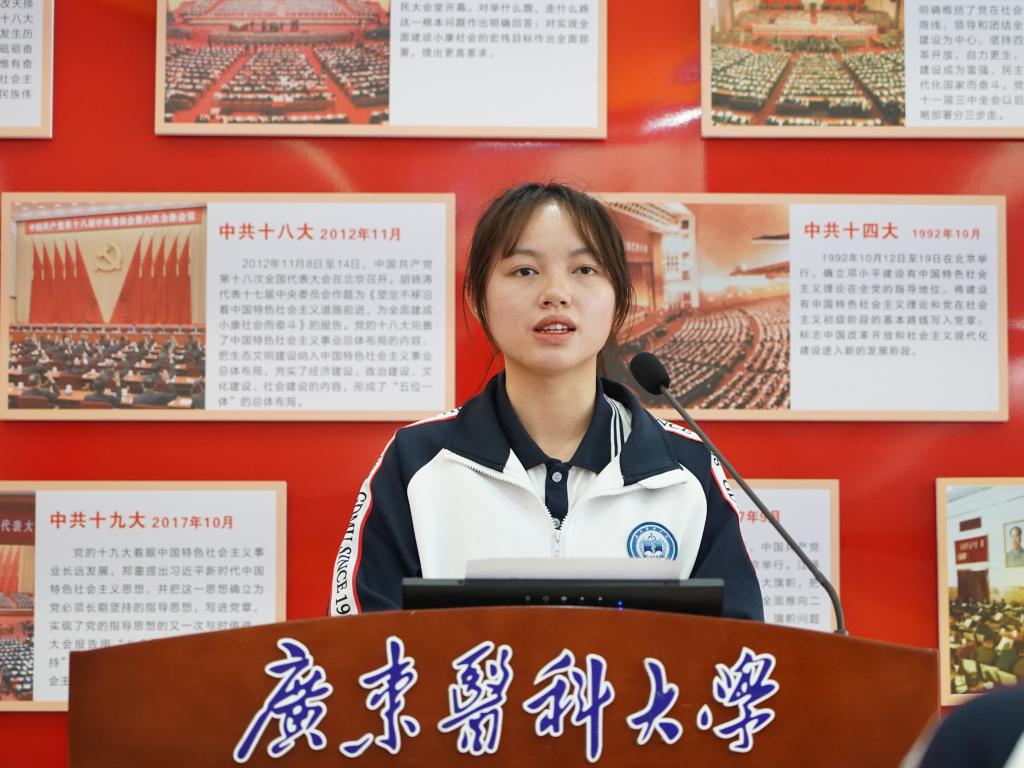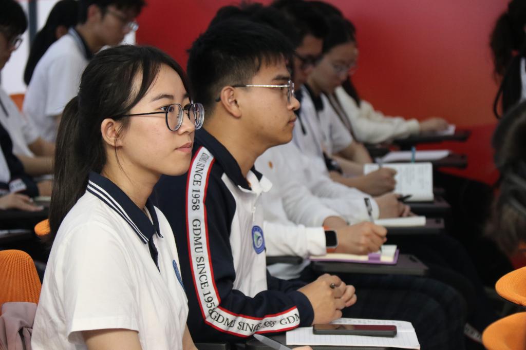 课堂上,公共卫生学院2022级卫生毒理学专业研究生曹静怡;第二临床医学院2021级口腔医学专业张婉晴、赖彦霖;药学院2020级临床药学专业朱俊儒;基础医学院2019级法医学专业闫司雨等5位同学结合在学校学习的思考、担任学生组织岗位工作的锻炼、学习英国上市公司365总书记重要讲话的体会等,讲述了广东医学子与时代同行,与学校发展同频,与祖国建设同进的青春故事,展现了积极向上、拼搏奋斗、追求卓越、乐于奉献的良好精神面貌。