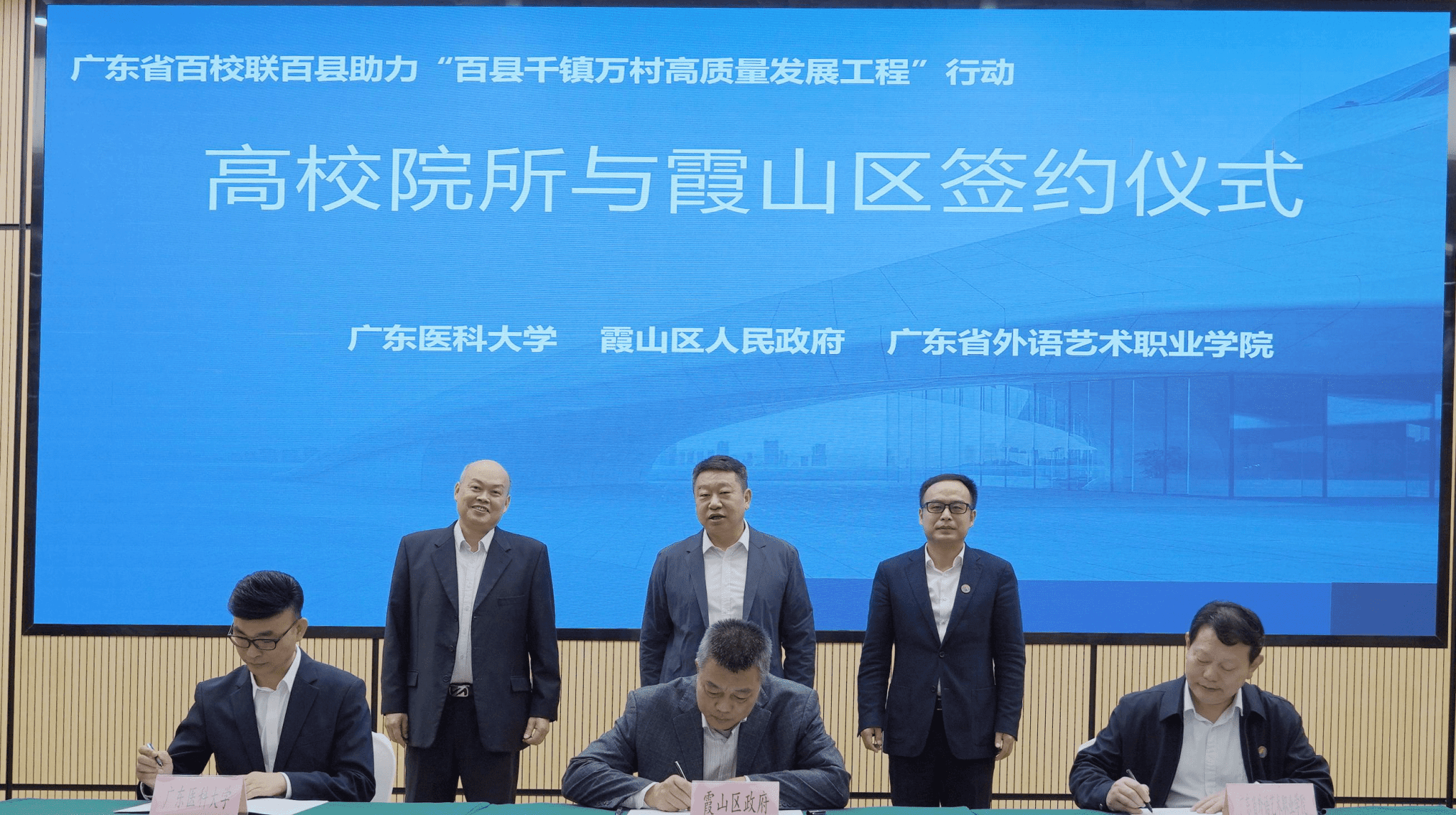结对共建签约仪式上,区委常委、常务副区长李荣泽,我校党委副书记黄达海,广东省外语艺术职业学院党委委员、副校长郝勇作为代表签约,聂兵、卢景辉、马栩生见证。会议由区委常委、组织部部长李浩主持。两校相关职能部门负责人及湛江市教育局、霞山区相关单位负责人参加。与会人员还观看了霞山区“百千万工程”宣传片。区委常委、常务副区长李荣泽介绍了区基本情况。市教育局党组成员、副局长、二级调研员胡德海代表市“双百行动”专班讲话。广东外语艺术职业学院党委书记马栩生也对该校的情况作了简要介绍。