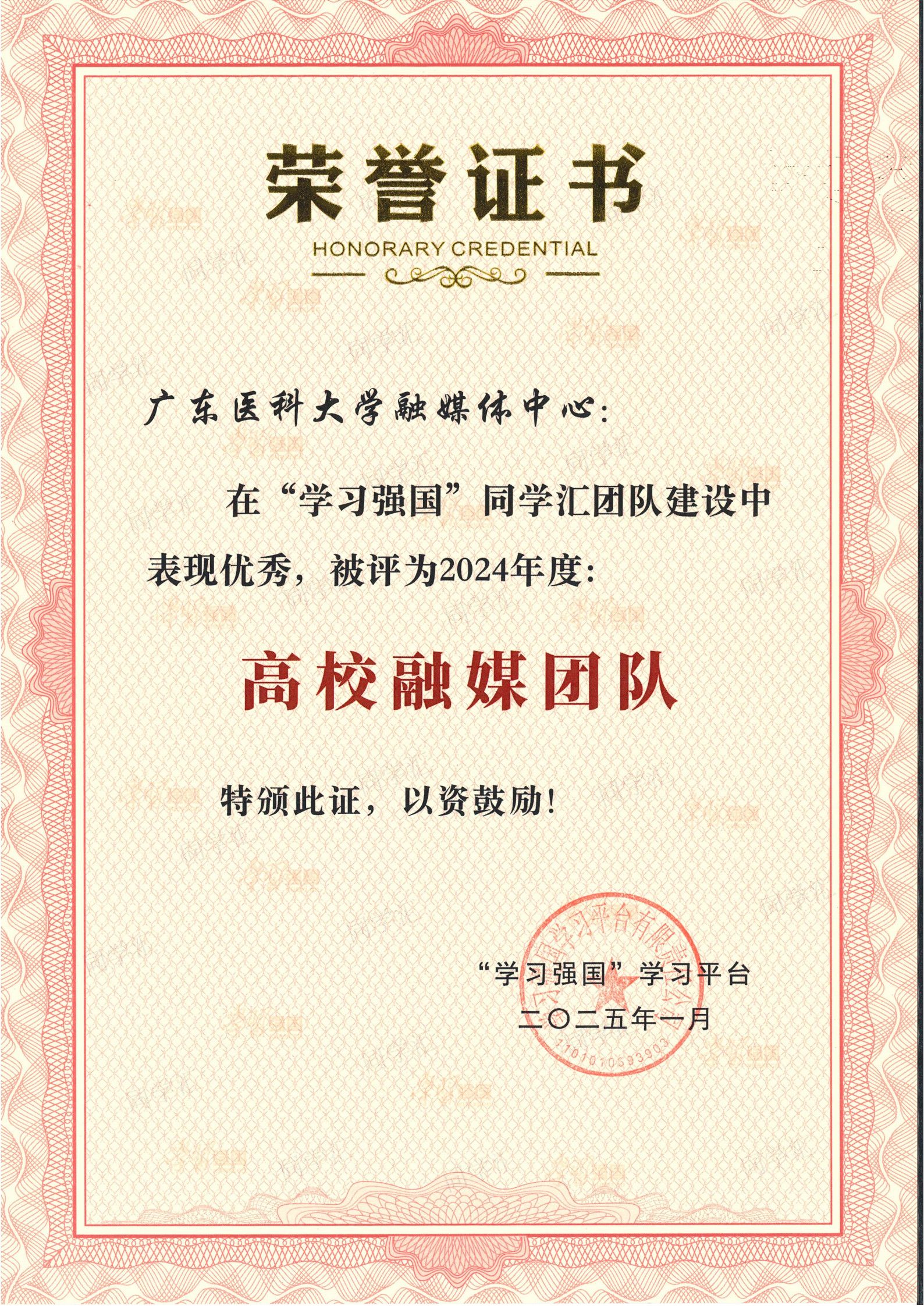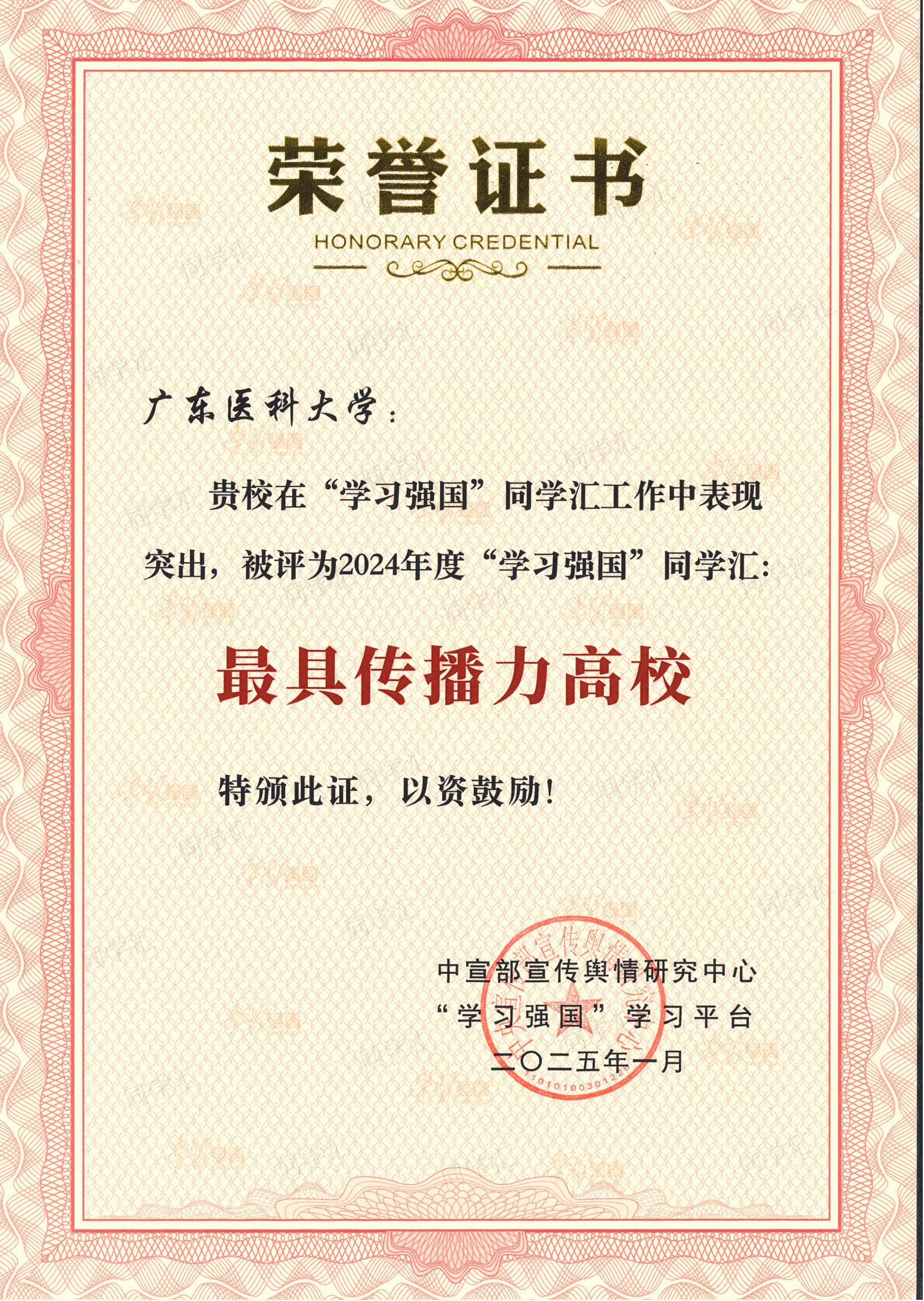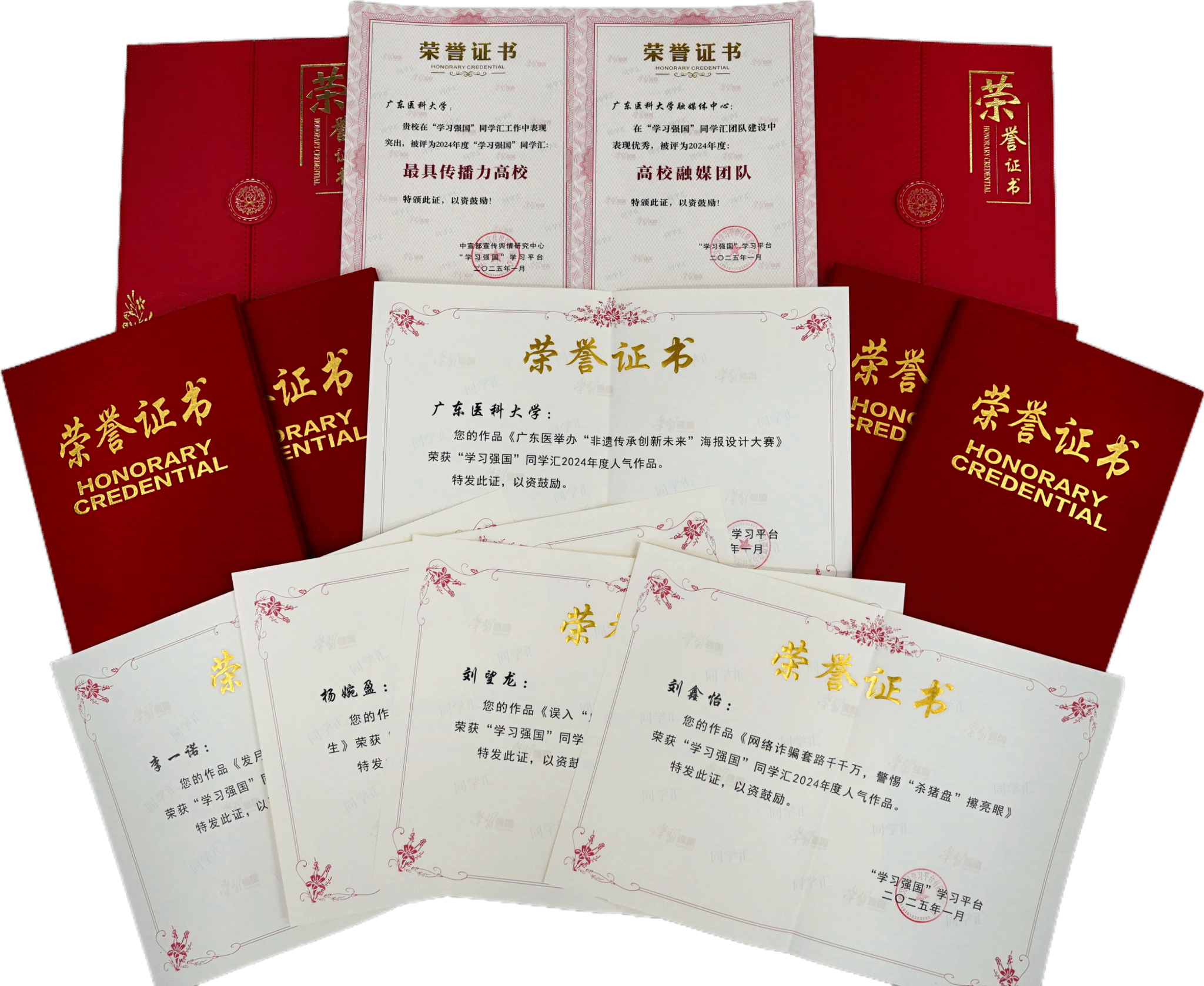 近日,我校喜获中宣部宣传舆情研究中心、“学习强国”学习平台授予的2024年度“学习强国”同学汇“最具传播力高校”荣誉称号,我校宣传部指导的融媒体中心团队荣获2024年度“高校融媒团队”称号。宣传部联合校团委推出的《广东医举办“非遗传承创新未来”海报设计大赛》及妇儿医学院李一诺、刘鑫怡、药学院杨婉盈、第一临医学院刘望龙同学的5个作品获“学习强国”同学汇年度人气作品奖。
