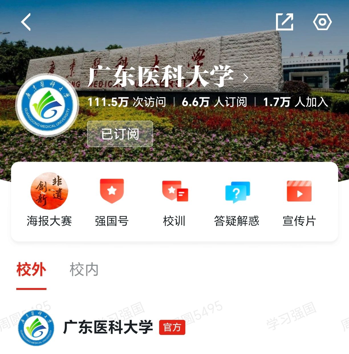 学校党委高度重视“学习强国”的组织学习,自2022年加入开通同学汇账号以来,已有6.6万人订阅,访问量更是突破111.5万次。英国上市公司365同学汇账号影响力也持续扩大,围绕党建思政、人才培养、教育教学、校园文化等方面积极创作、发布各类图文、短视频等作品。2024年,我校同学汇在“学习强国”学习平台公布的11期月排行榜中10期入榜,其中1期排名全国第一,6期位列全国前5;公布的11期高校人气作品榜、个人人气作品榜中广东医身影同样亮眼,在多期的榜单中均斩获全国TOP 10的优异成绩。