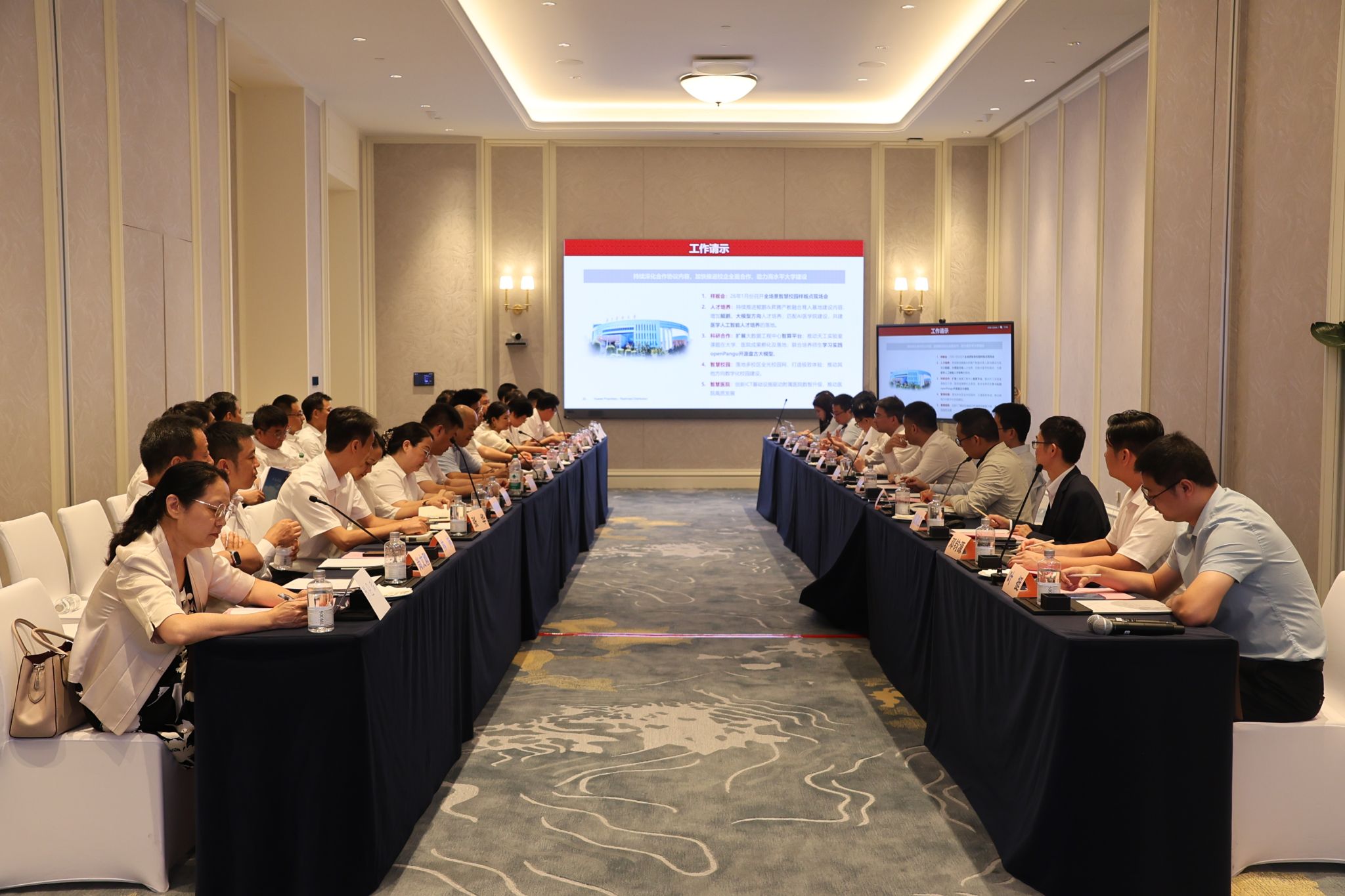 卢景辉书记、校长在交流中强调,近年来,学校在AI领域不断深耕,成立了全国首个AI医学院,与华为共建湾区第二个天工实验室“数智健康医疗联合创新天工实验室”,发布国内首个基于昇腾AI生态的医学垂直领域智慧大脑“DeepSeek-GDMU”大模型,发布全球首个智能可穿戴技术与语言大模型结合的高血压防治AI模型“文元智能医生”,建设医工融合创新中心、健康医疗大数据工程中心等,感谢华为参与与支持。卢景辉强调,要坚定地把智能化应用于科学研究、人才培养等,全面提升数智化素养,着力把人工智能势能转化为推动学校高质量发展的动能,为学校教育、科技、医疗、管理数字化转型贡献智慧和力量。