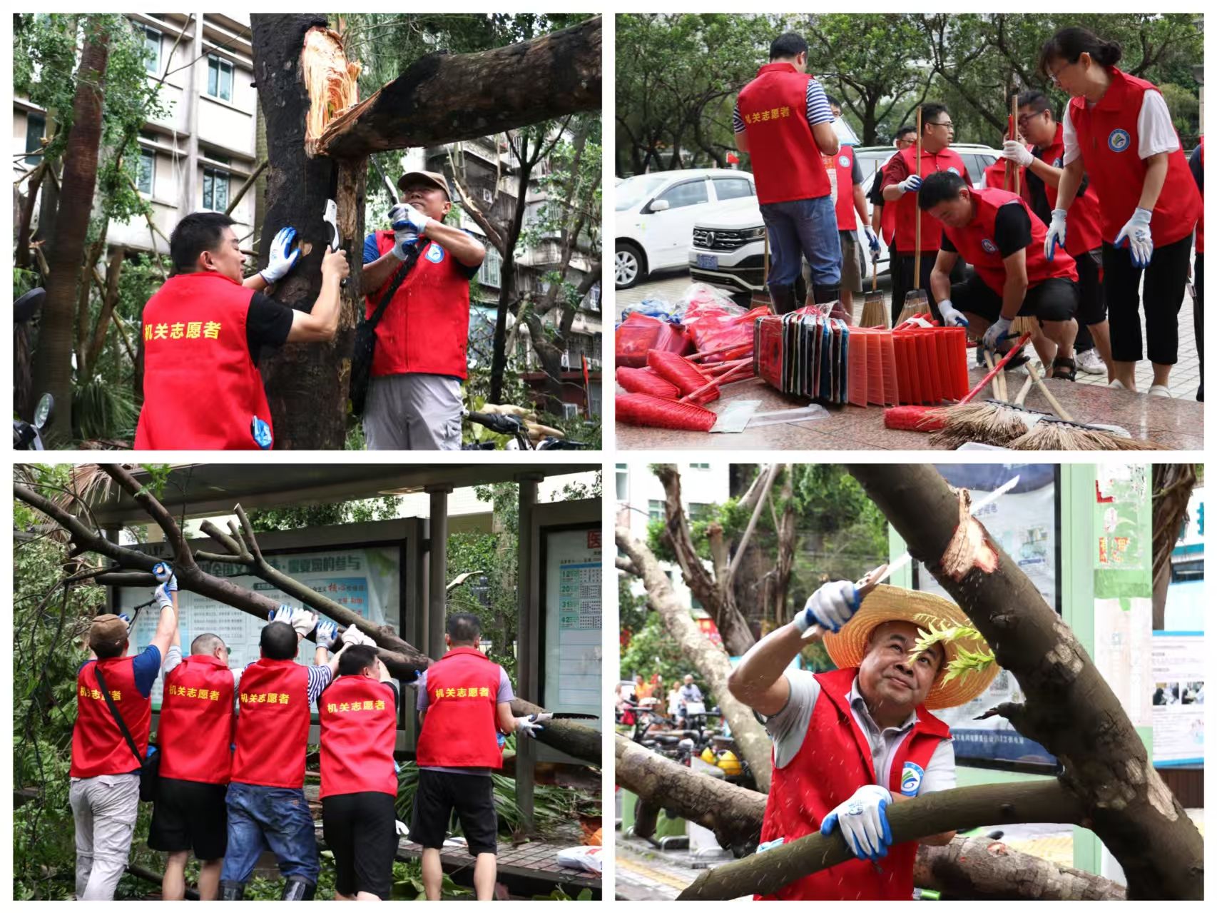 机关党委第一时间组织,校内外都派员积极参与。6名机关党委突击队员以军转干部的过硬作风参与地方政府灾后秩序恢复,在文明东路北侧锯断约20棵倒伏树木、清理500多米路段,疏通水道,保障小区与非机动车道正常通行,获得群众高度认可。陈海容老师看到志愿者忙碌的身影时动容道:“师生们的热情像一束束光,让我们面对灾难不再孤单。”