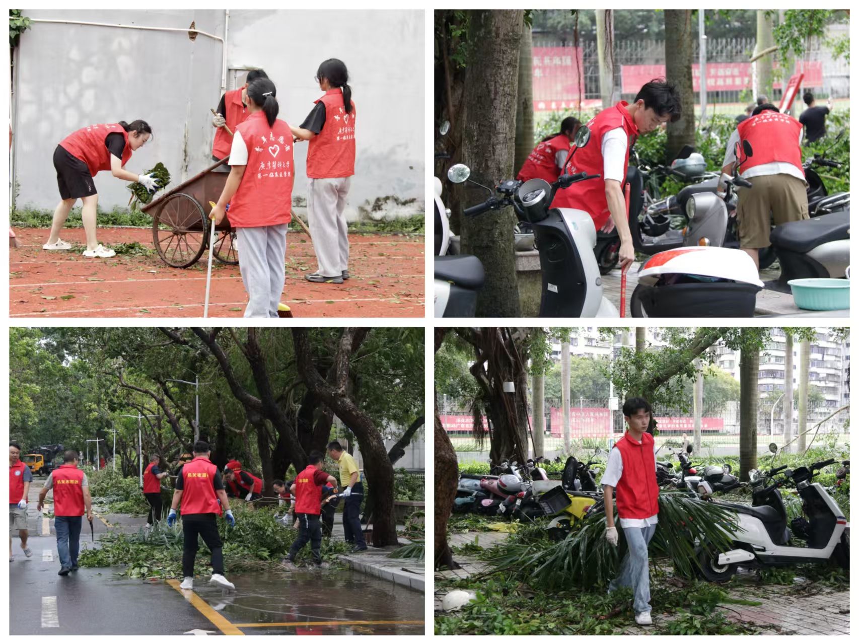 海洋与热带医学学院师生或合力搬开倒伏树干,或细致清理路面断枝杂物,并与学校设备处、后勤处相关工作人员一同检查实验楼受损情况,彻底消除安全隐患。