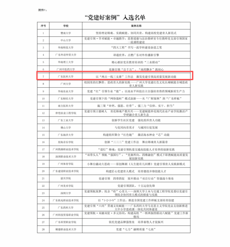 近日,广东省委教育工委公布“党建好案例、书记好党课、党员好榜样”优秀成果入选名单,我校报送的党建工作案例《以“两点一线三支撑”工作法 激发党建引领高质量发展新动能 》入选“党建好案例”,成为全省教育系统基层党建工作的示范成果之一。