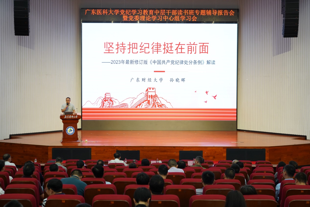 学校邀请了广东财经大学马克思主义学院副院长孙晓晖教授作专题辅导报告。孙教授从条例的修订背景、修订意义、过程、内容等方面,结合运用大量的典型案例,采用采取新旧对比方式,作了生动全面的党纪学习教育辅导报告,为全校广大党员干部准确把握条例的内容、进一步加强纪律作风建设提供了指导和帮助。