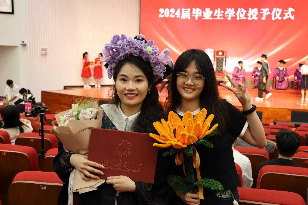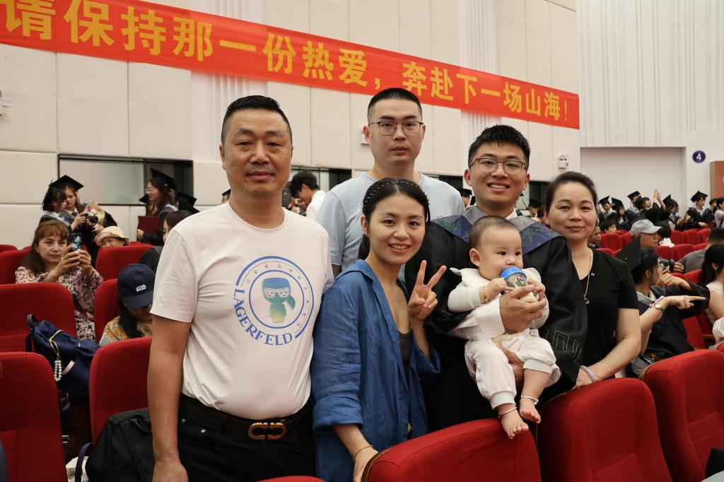 毕业典礼现场温情无处不在,有闺蜜特制的手工簪花学士帽,祝福毕业生未来的人生道路一路繁花。有怀抱鲜花含笑的老父亲,父爱在这一刻如山巍峨。还有叼着奶瓶的小外甥来参加舅舅的毕业典礼,家人表示希望小外甥也像舅舅一样未来学医,做一个救死扶伤的好医生。从上台到接过证书,可能只有短短的几十秒,有一个一直跟随毕业生的镜头,记录他们这人生这珍贵的时刻。亲爱的毕业生们,你们的身后有学校、有亲友,未来,一定要过最棒的人生。
