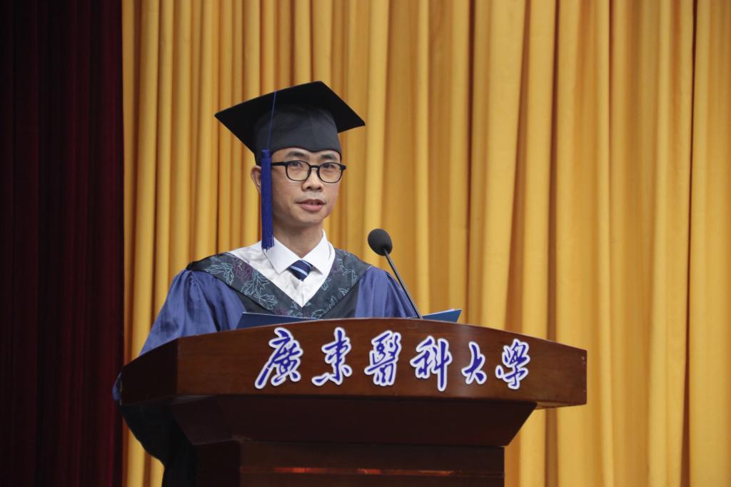 研究生毕业生代表、第一临床医学院黄总封表示,这三年在老师们的辛勤指导下,我们在广医经历了成长的蜕变,体验了艰辛,也收获了喜悦,最终明白了幸福是靠奋斗出来的。从开始对研究生生活的不适应,到现在毕业在即的依依不舍;从开始的科研小白,到现在对科研的喜欢。有太多的不舍,不舍离开学校、不舍离开辛勤培育我们的老师。工作十年再读研的“最强奶爸”重回学校,感受师恩,倍感亲切!得此师恩,将会成为我往后人生的道路上勇往直前、乘风破浪的动力。我会将这种爱传到每一个病人身上。